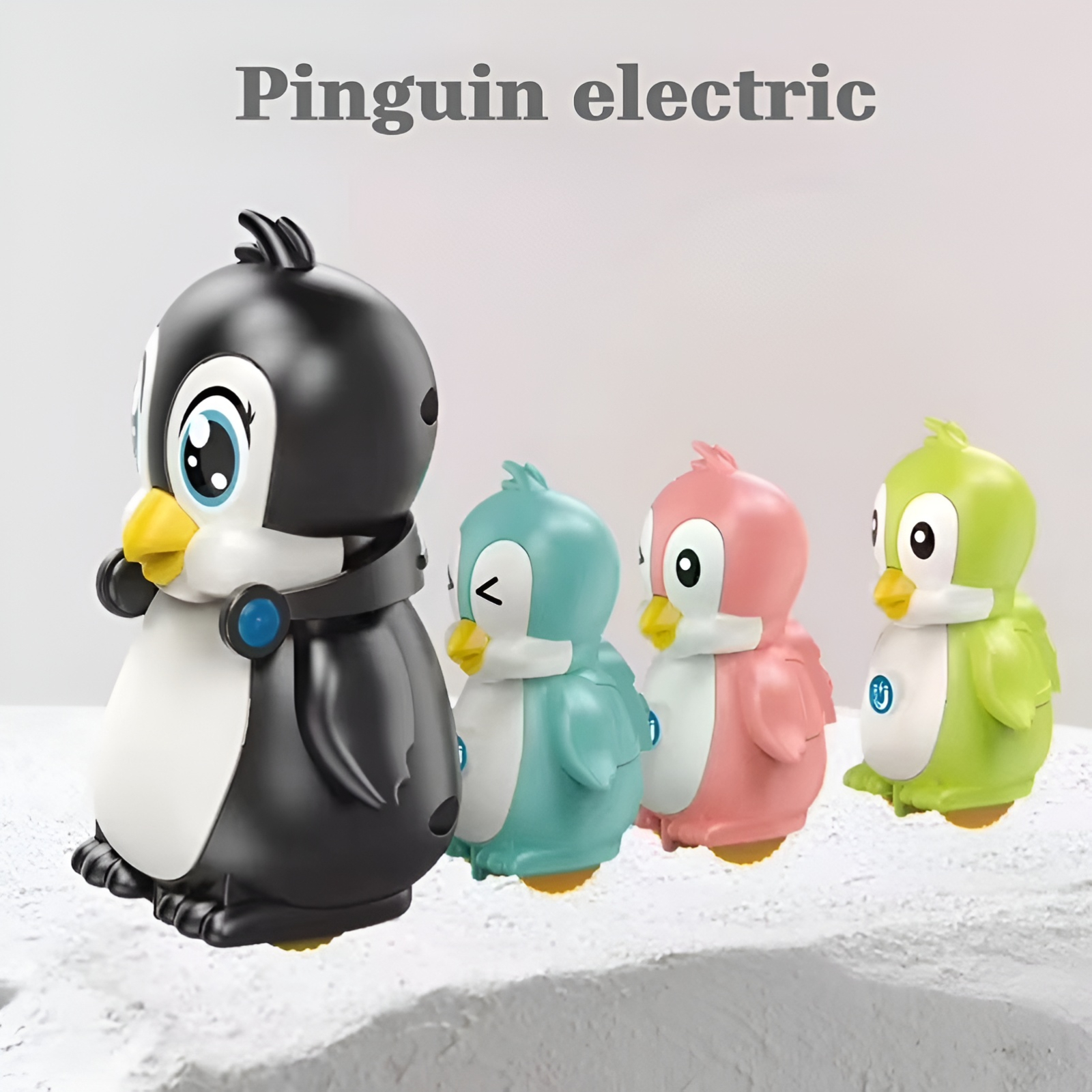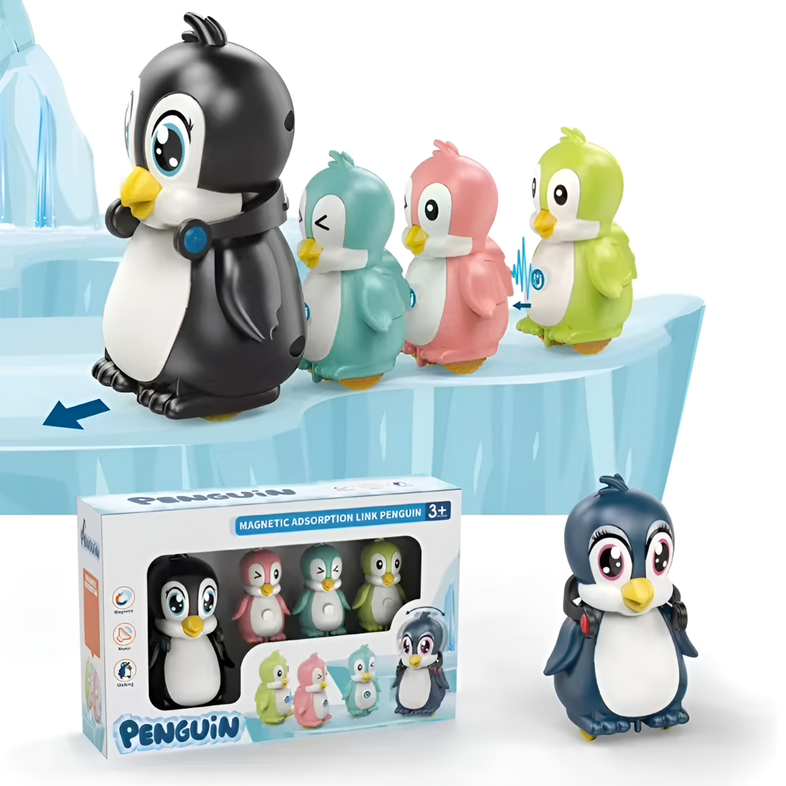 Pinguinul mare conduce întreaga familie, iar cei mici îl urmează prin atracție magnetică. Copiii adoră să-i vadă cum merg împreună și cum redau sunete amuzante.