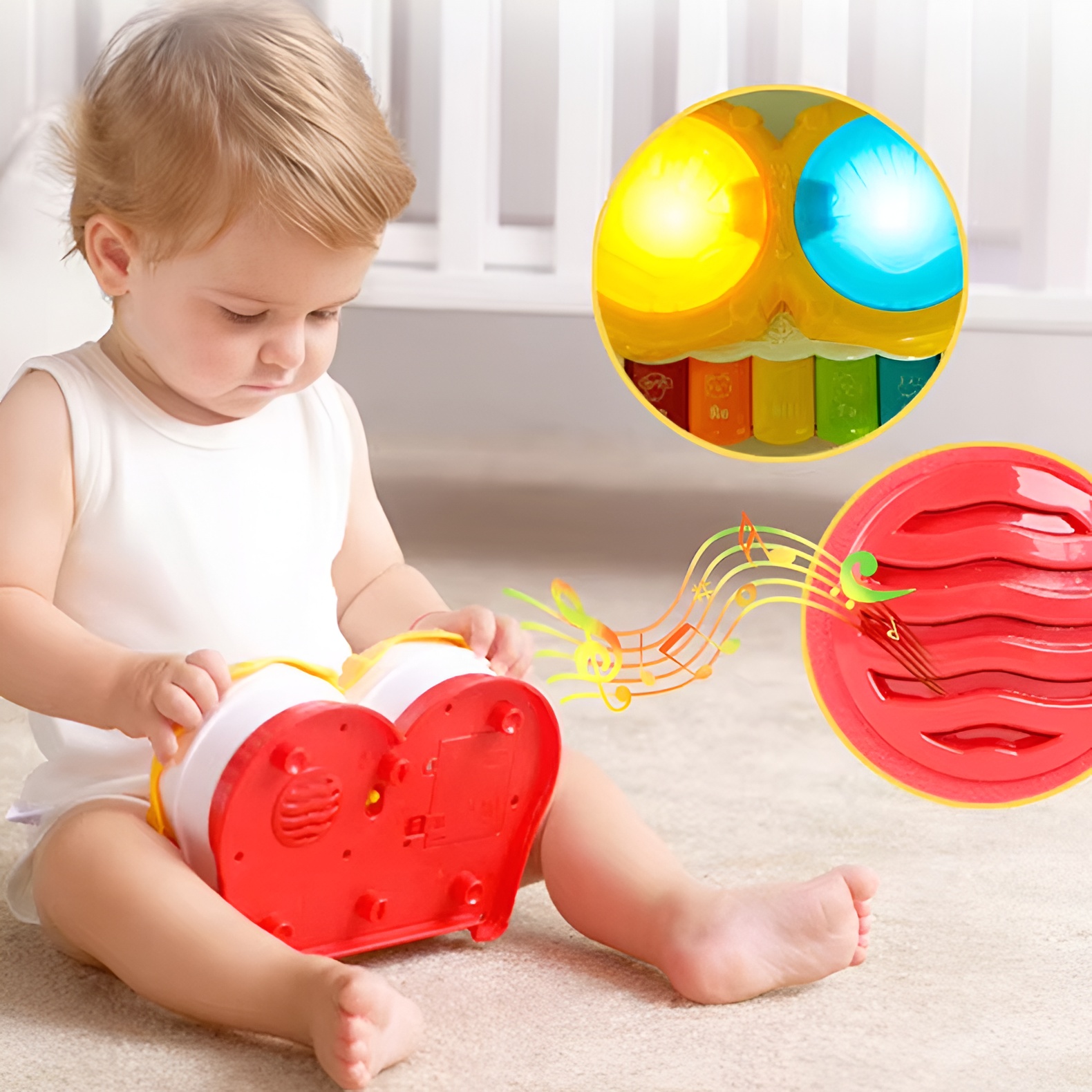 Cele două tobe sensibile la atingere emit sunete armonioase și se aprind cu lumini LED blânde, sigure pentru ochi, stimulând atenția și coordonarea copilului. În partea de jos, copilul poate apăsa tastele Do, Re, Mi, Fa, So, care redau sunete, melodii și efecte amuzante – perfecte pentru dezvoltarea auzului și învățarea timpurie a muzicii.