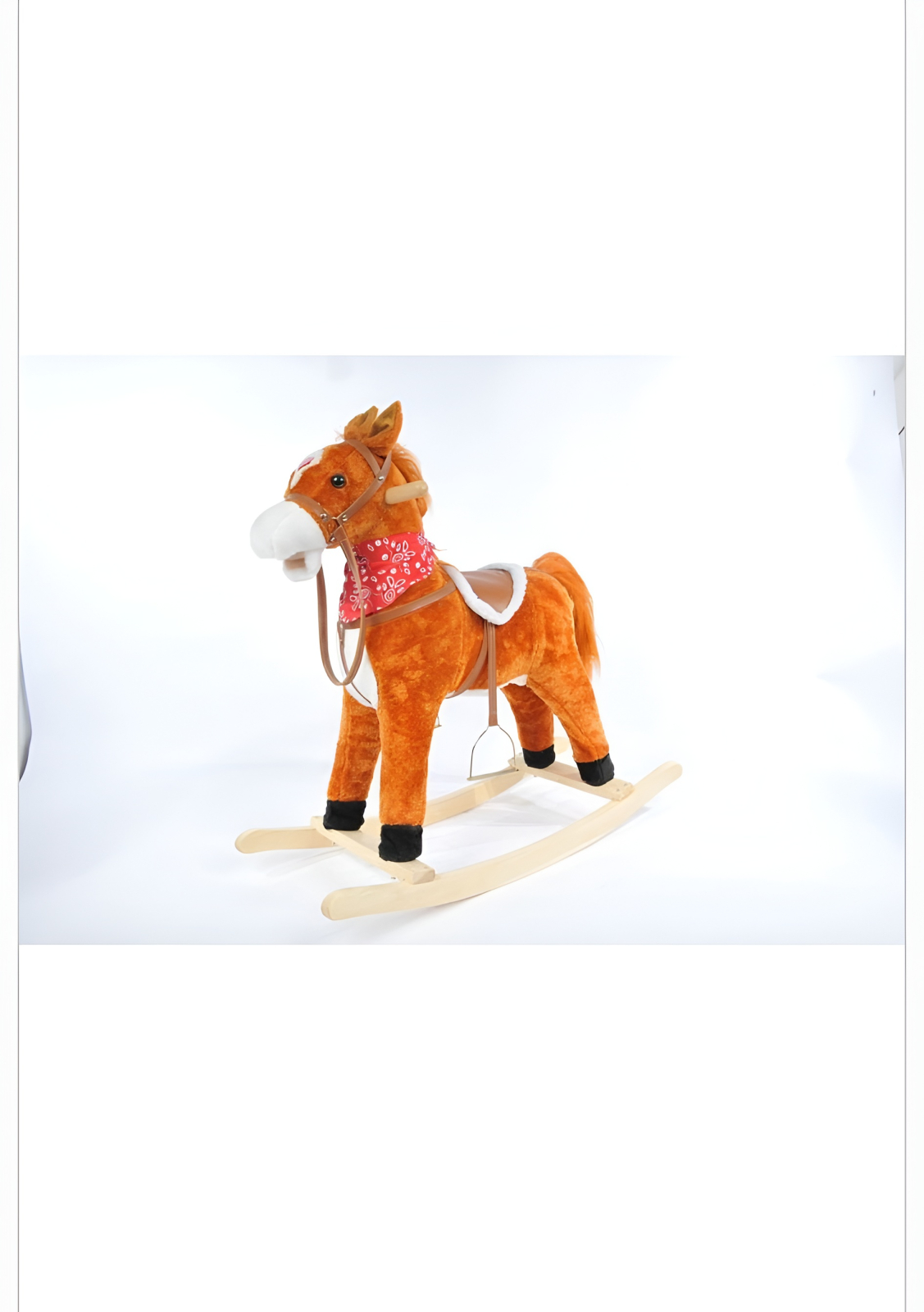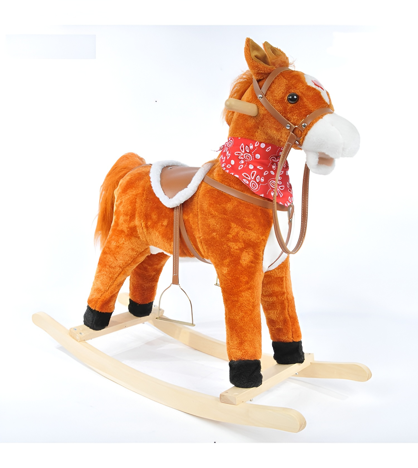 Calul este realizat din pluș dens și catifelat, cu șa confortabilă, frâu solid și eșarfă decorativă tip cowboy, oferind un aspect spectaculos și plăcut vizual. Baza din lemn masiv asigură stabilitate excelentă, iar mânerele din lemn îi oferă copilului prindere sigură în timpul balansării.