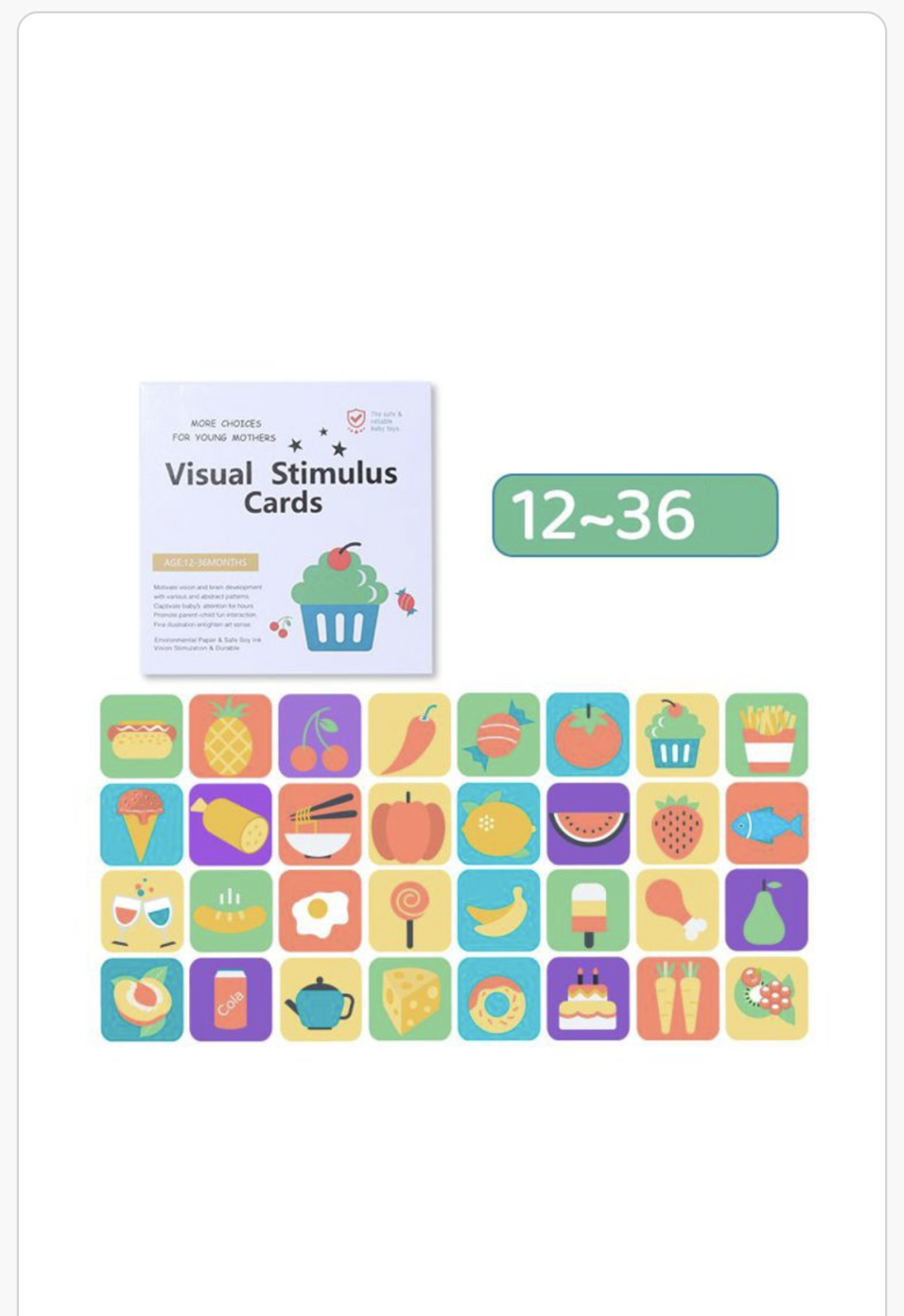 Carduri educative de stimulare vizuală pentru copii 12–36 luni – set colorat cu alimente, forme și obiecte pentru învățare timpurie