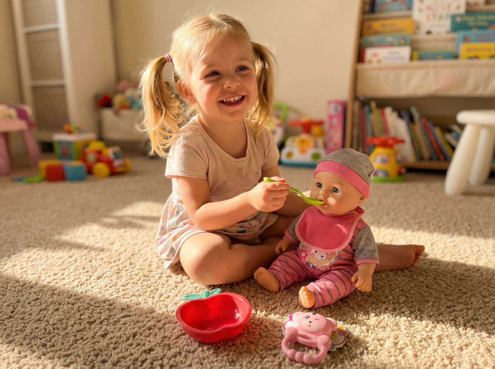 Păpușa Bebe Interactivă de 30 cm este jucăria perfectă pentru fetițele care adoră jocurile de rol! Cu un design realist, chip expresiv și corp moale, această păpușă oferă o experiență autentică de îngrijire și joacă. Setul include tacâmuri, biberon, bavetă, jucărie zornăitoare și recipiente pentru hrănire, astfel încât copilul poate imita perfect momentele de îngrijire ale unui bebeluș adevărat.