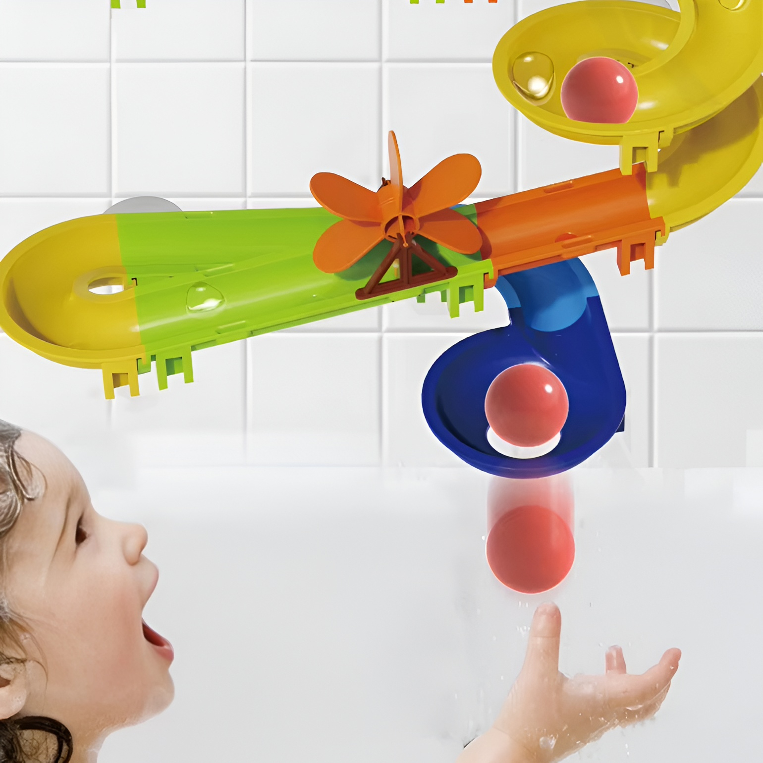 Setul include piese modulare care pot fi asamblate în diferite configurații, permițând copilului să creeze propriul traseu de alunecare pentru bile. Datorită sistemului de prindere cu ventuze, pista se fixează ușor pe suprafețe netede precum faianța sau cada, fiind ideală pentru joaca în baie.