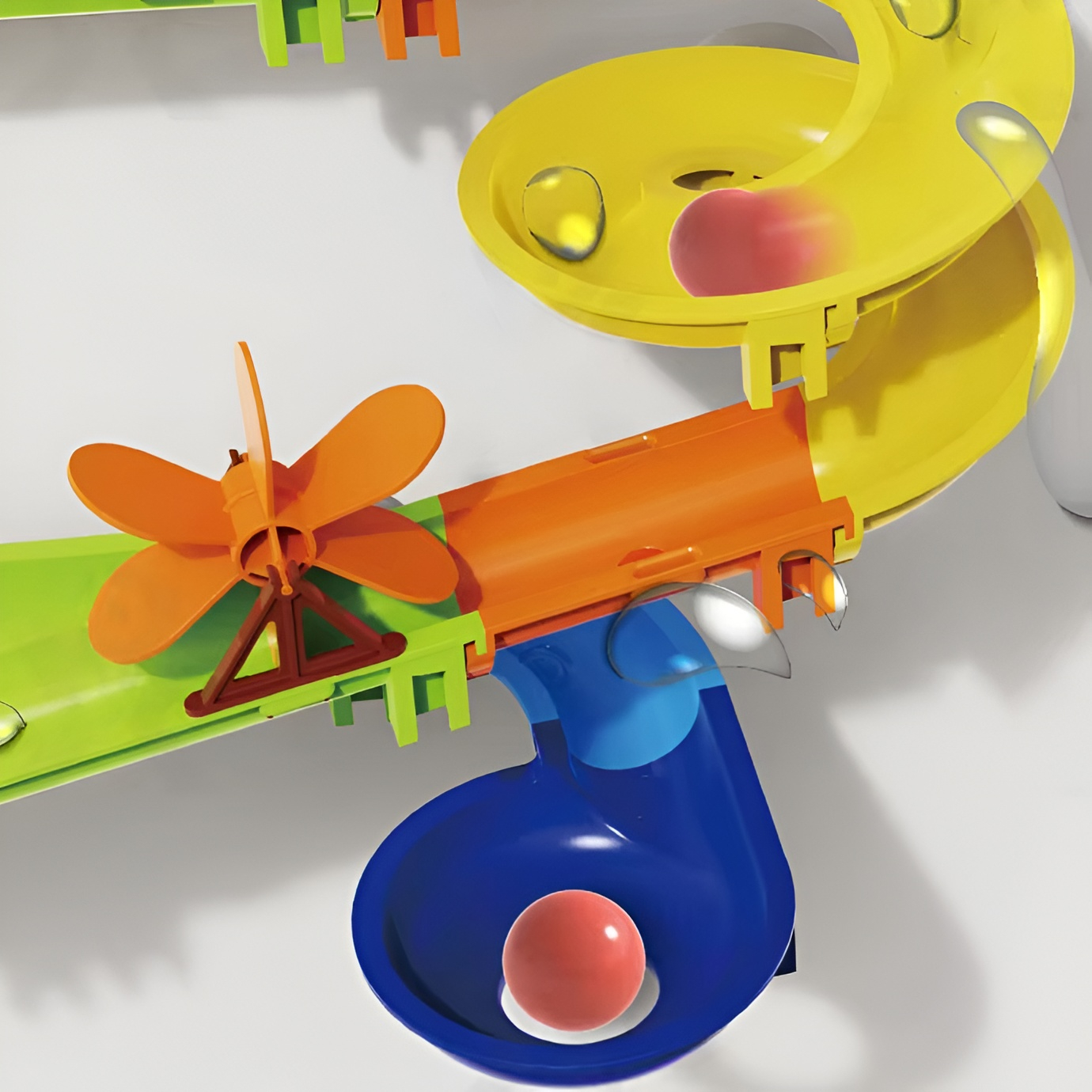 Copiii pot urmări bilele cum alunecă pe traseu, trec prin curbe, canale și elemente rotative precum morișca interactivă, dezvoltând astfel coordonarea mână–ochi, gândirea logică și capacitatea de rezolvare a problemelor.