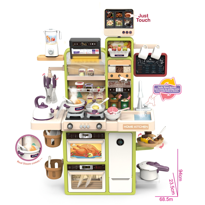 Această bucătărie de jucărie Dream Kitchen de 94 cm este un model premium, complet echipat, cu funcții interactive care imită perfect o bucătărie reală.