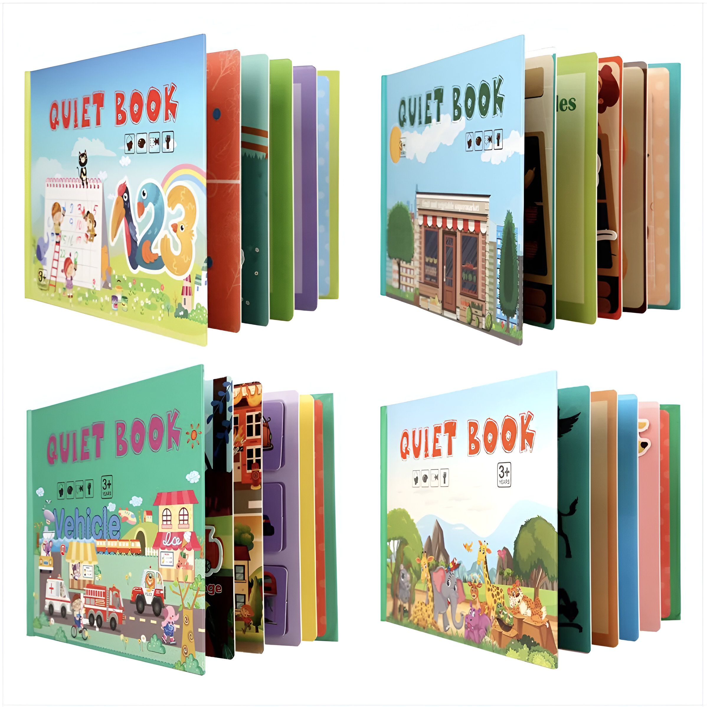 Transformă învățarea într-o joacă distractivă cu Quiet Book Montessori – o carte interactivă cu activități educative, disponibilă în 4 teme atractive: Numere, Legume, Vehicule și Animale.